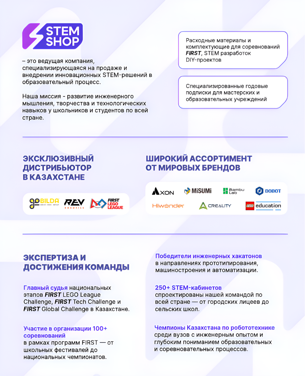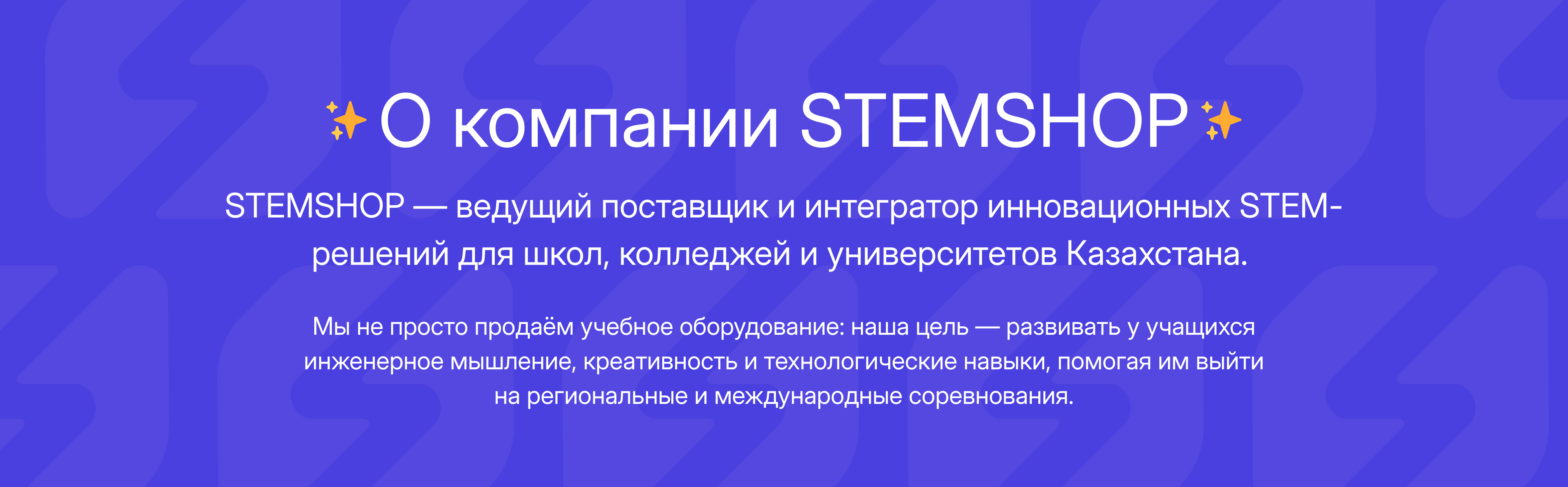 STEMSHOP — ведущий поставщик и интегратор инновационных STEM-решений для школ, колледжей и университетов Казахстана. Мы не просто продаём учебное оборудование: наша цель — развивать у учащихся инженерное мышление, креативность и технологические навыки, помогая им выйти на региональные и международные соревнования.