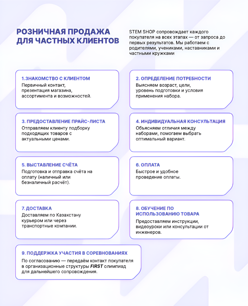 | Розничные и оптовые продажи | Быстрый подбор наборов, счёт-фактура и доставка по всему Казахстану. |