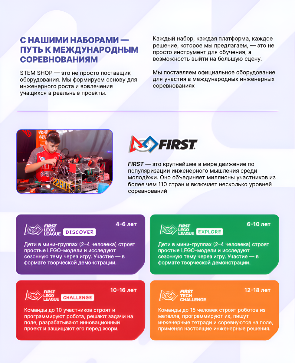 - Широкий ассортимент: от расходных материалов для DIY-проектов до полноценных лабораторных комплексов для FIRST Tech Challenge и FIRST LEGO League.