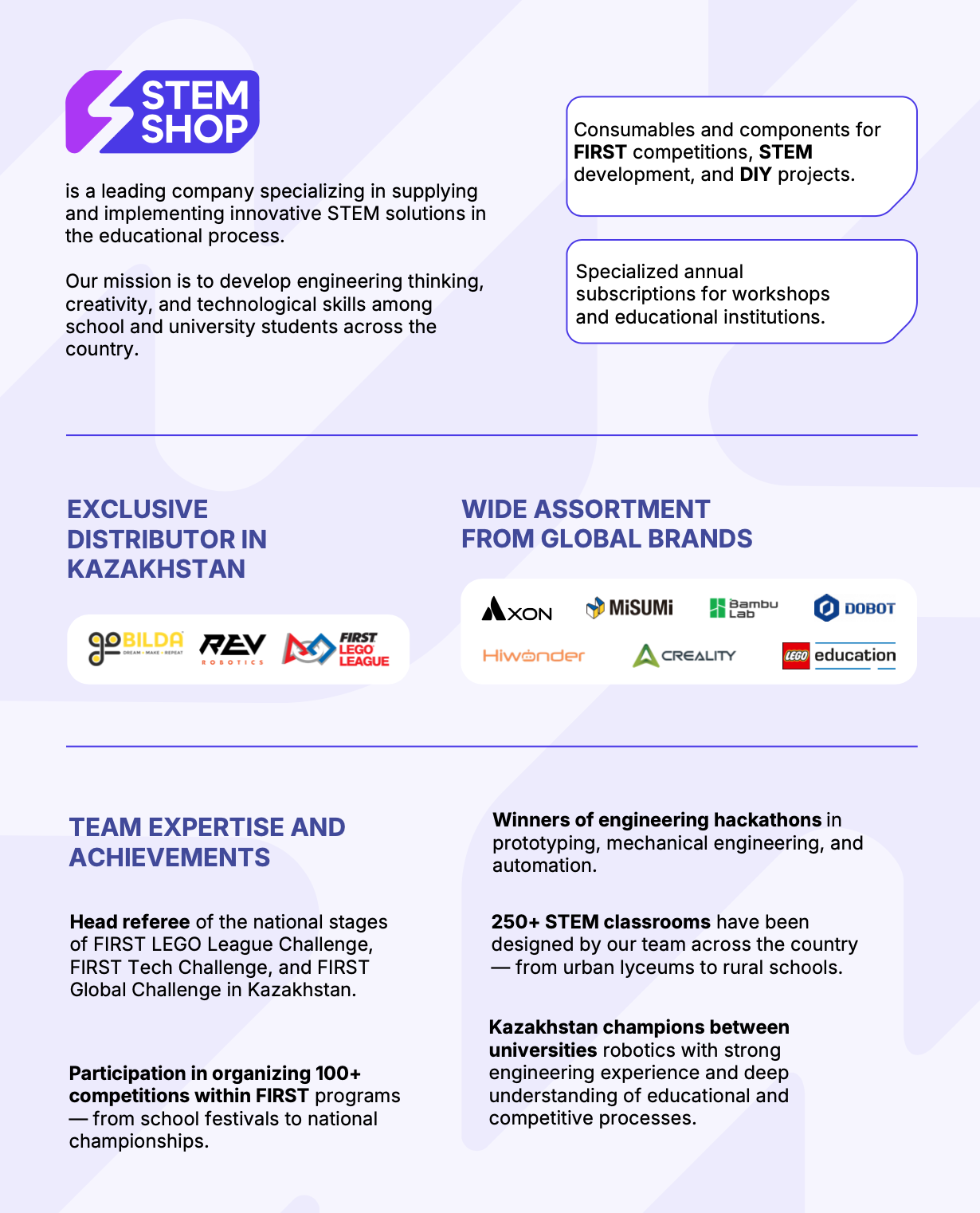 - Exclusive distributor of globally recognized STEM equipment brands in Kazakhstan.
