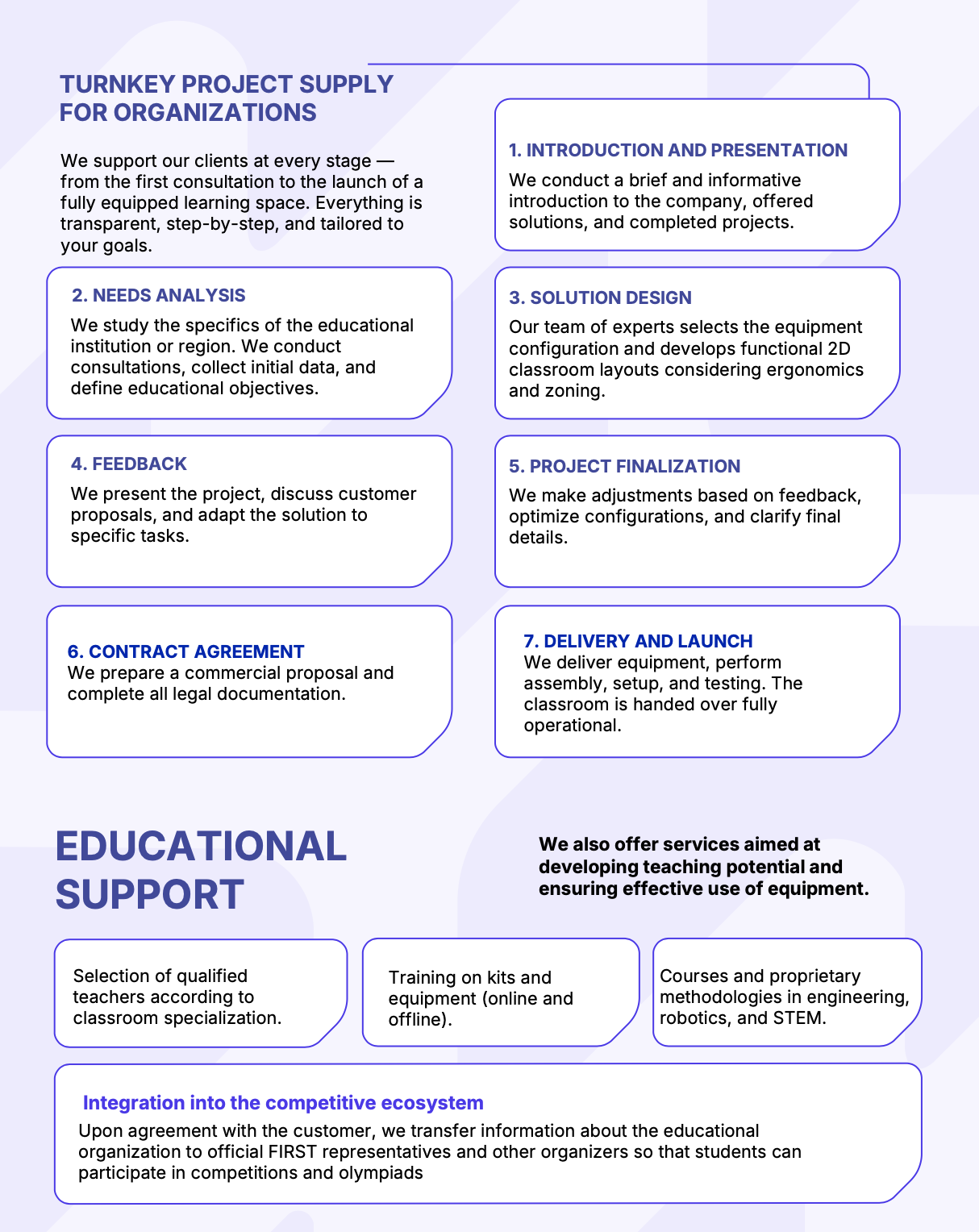 | Turnkey Project Delivery | Needs analysis, 2D planning, supply, installation, and commissioning of classrooms. |