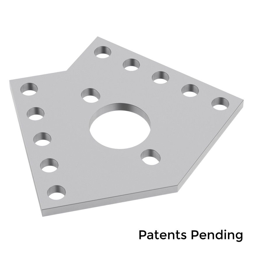 1108 Series Flat Pattern Bracket (2-2) представляет собой плоский алюминиевый элемент, предназначенный для формирования угла 135° между двумя пластинами или участками канала. Каждая сторона имеет по пять отверстий с шагом 8 мм, совместимых с деталями на сеточной основе.