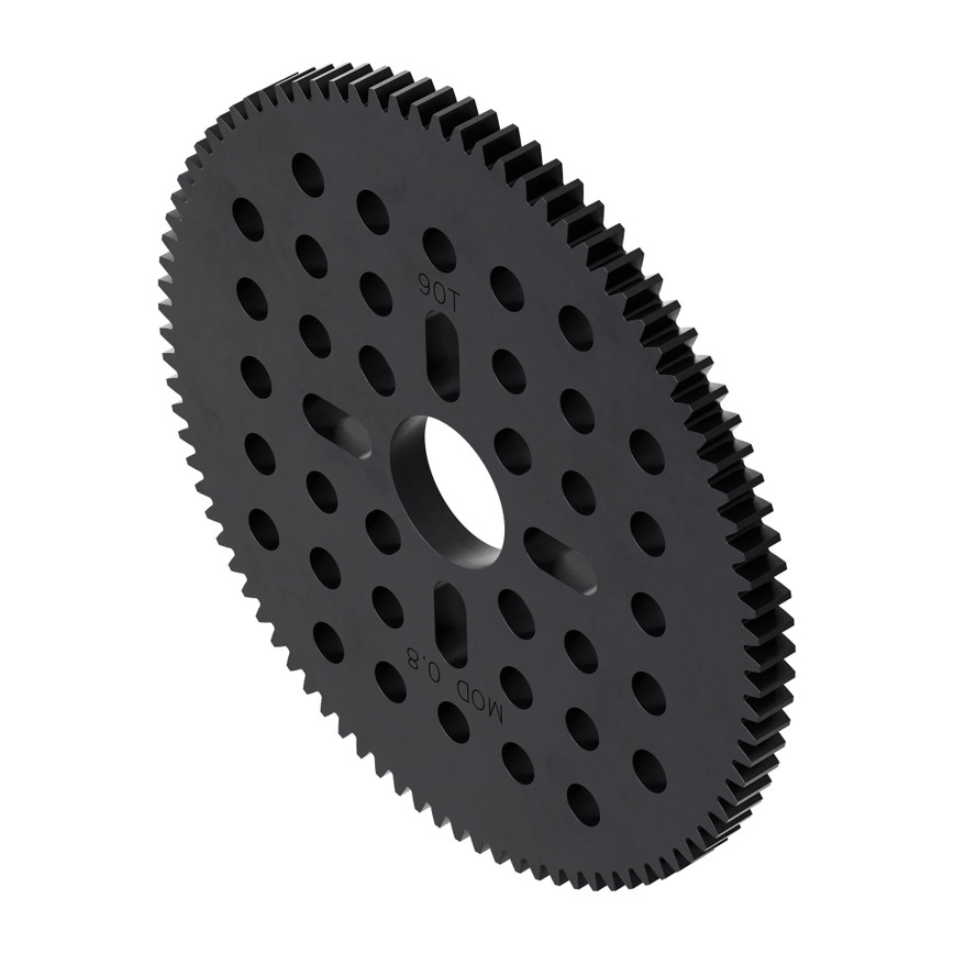 90 Tooth Hub-Mount Gear (MOD 0.8, 4mm Thick Acetal) представляет собой прочную ацеталовую шестерню с 90 зубьями и шагом MOD 0.8. Совместима с любыми шестернями MOD 0.8, но чаще всего используется вместе с 30-зубой серво- или пиньон-шестернёй. При комбинации с серво-шестернёй создаётся передаточное отношение 3:1, которое снижает скорость вращения и увеличивает крутящий момент втрое.
